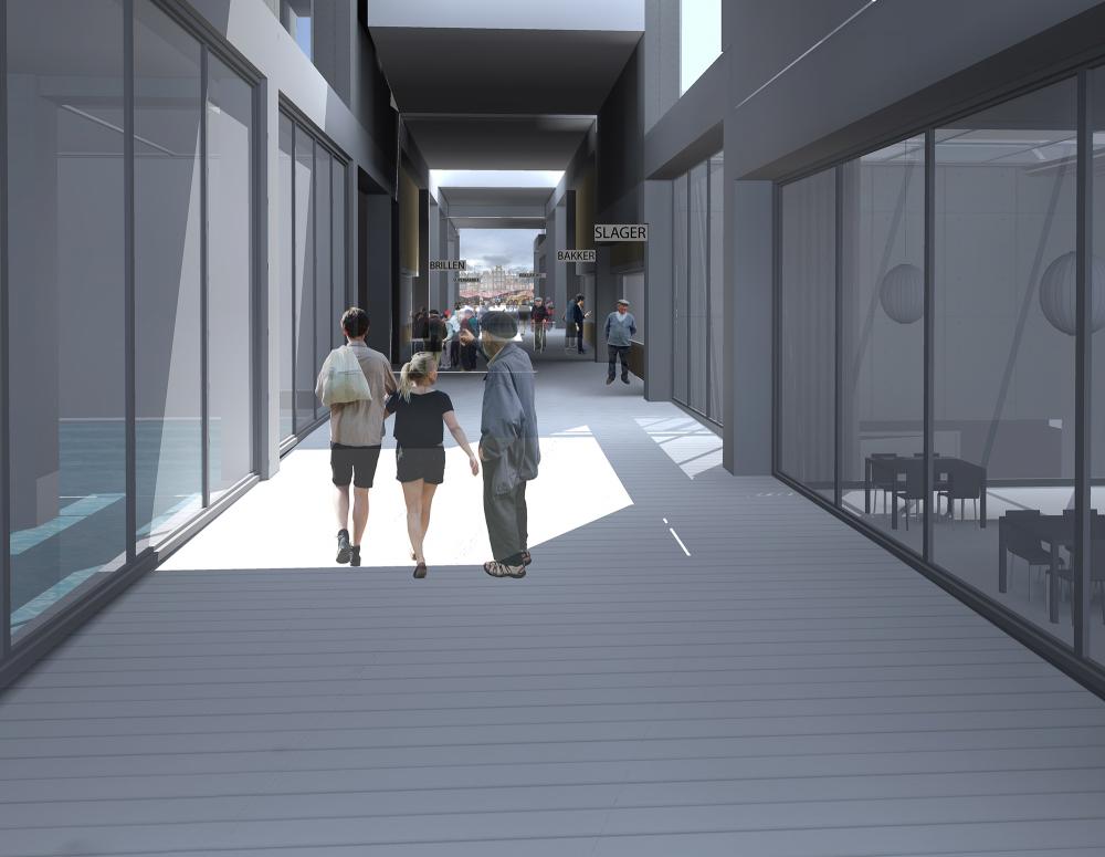 Deze publieke route ontsluit alle woningen, welke ieder zijn uitgerust met ruimte voor een bedrijfje of hobbies, zodat deze vaardigheden en kennis gezien en geleerd kunnen worden. Door een aantal verticale schachten wordt, naast de hellingsbaan, altijd een snelle directe toegang tot de woning gegarandeert.